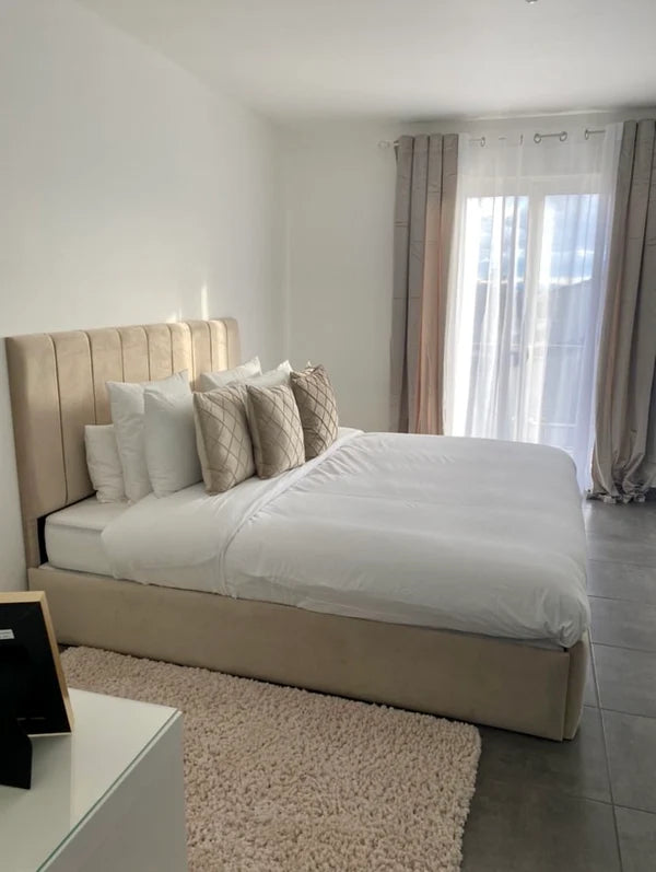 Le cadre de lit 2 places Polo propose à votre chambre à coucher une allure haut de gamme et royale. Ses finitions simples et élégantes à la fois, son tissu en velours gris de très bonne qualité, assurent à votre cadre de lit de se marier aisément à tout type d’intérieur. Votre cadre de lit dispose d’une structure métallique résistante d’une grande longévité. Il pourra ainsi sublimer vos nuits durant de nombreuses années. Votre cadre de lit 2 places est disponible en 3 dimensions, avec ou sans sommier, suivant votre choix.
