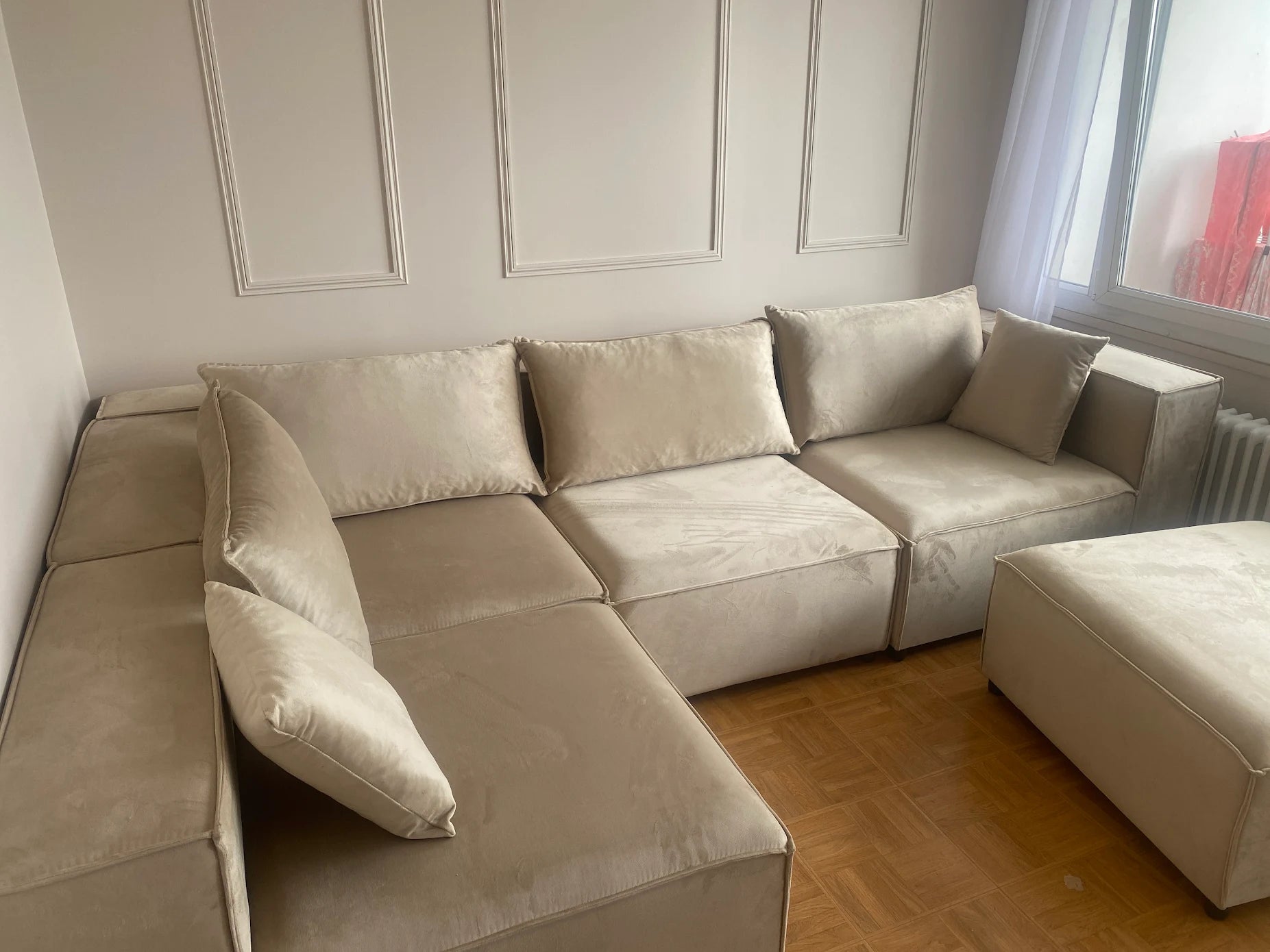 Votre espace jour s’orne d’un décor chic et raffiné avec notre sublime canapé Élégance 5 places modulables en tissue Velours Beige
