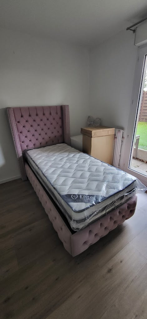 Lit Coffre Enfant CLOUTE ROSE - Velours capitonné