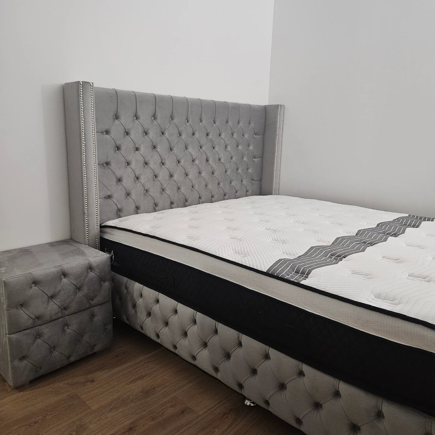 Lit Coffre CLOUTE GRIS - Velours capitonné
